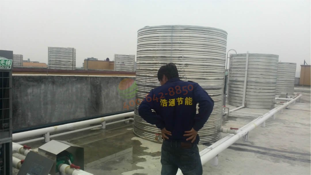 東莞聯合技工學校2100人學生宿舍42噸空氣能熱泵熱水工程-安裝師傅檢查安裝細節
