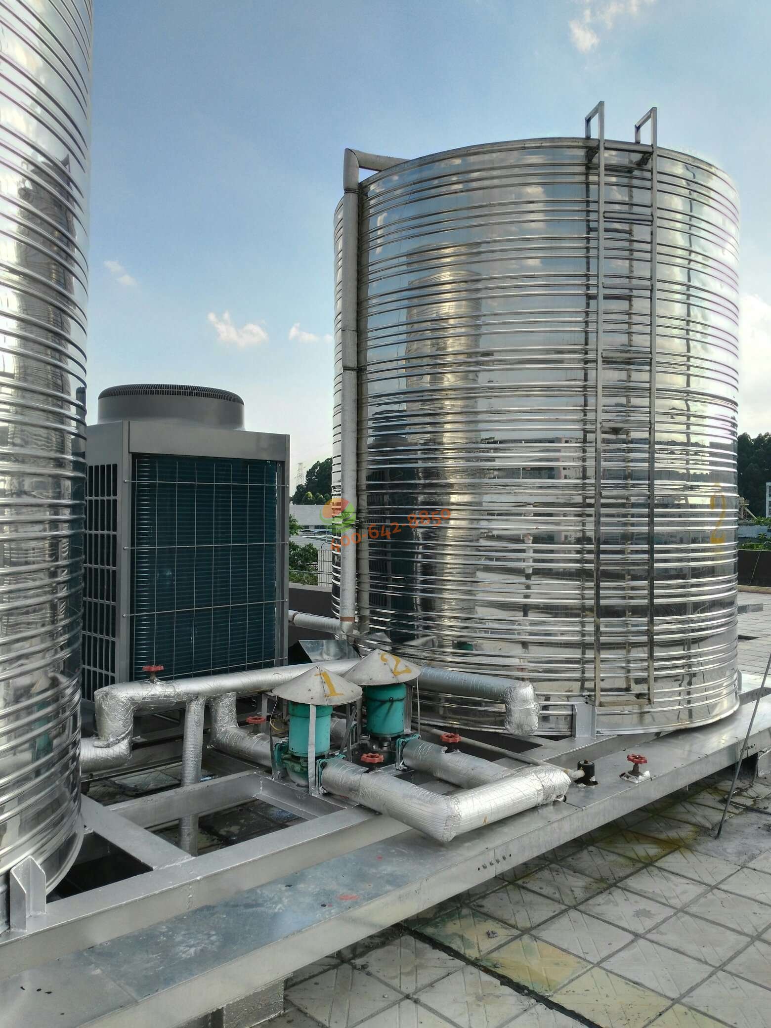 格力KFRS-39Z(M)/B2S(10P)空氣能熱泵熱水機3臺, 圓形10m3不銹鋼保溫水箱3個及相關配套設施 |