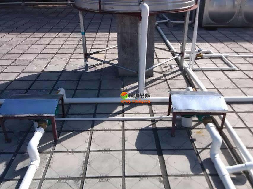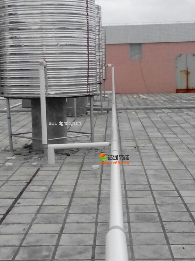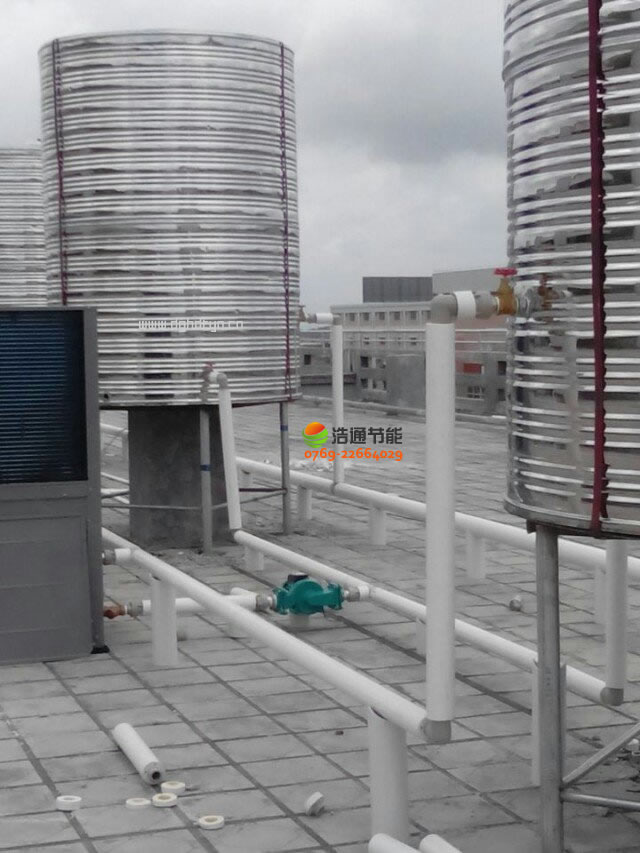 汕頭衛生學校新校區2000人美的空氣能熱泵熱水工程項目主機,水泵,水箱水管連接